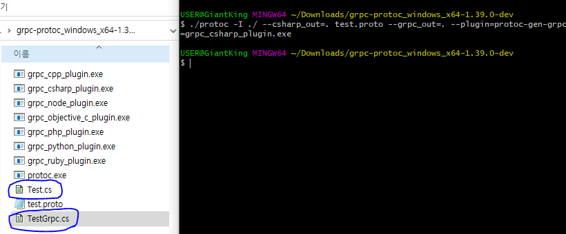 Windows Ex) ./protoc -I ./ --csharp_out=. test.proto --grpc_out=. --plugin=protoc-gen-grpc=grpc_csharp_plugin.exe